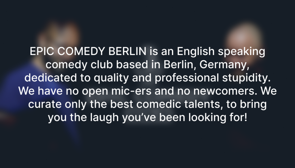 EPIC COMEDY BERLIN is an English speaking comedy club based in Berlin, Germany, dedicated to quality and professional stupidity. We have no open mic-ers and no newcomers. We curate only the best comedic talents, to bring you the laugh you’ve been looking for!